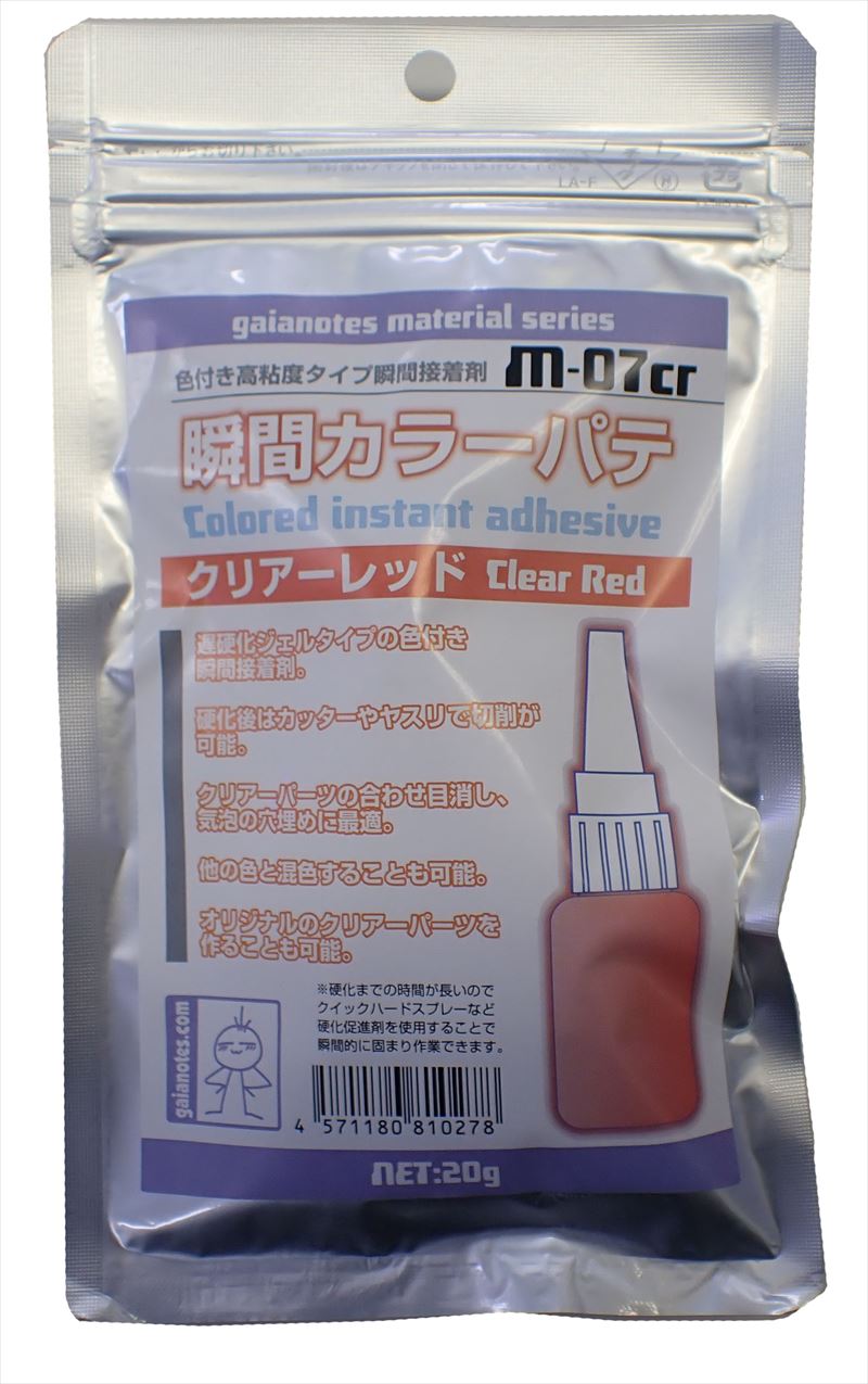 瞬間カラーパテクリアーはクリアーカラータイプの高粘度瞬間接着剤です。クリアーパーツの合わせ目消し、気泡の穴埋めなどに使用できます。硬化後はカッターやヤスリなどで切削が可能です。他のクリアーパテと混色することも可能です。